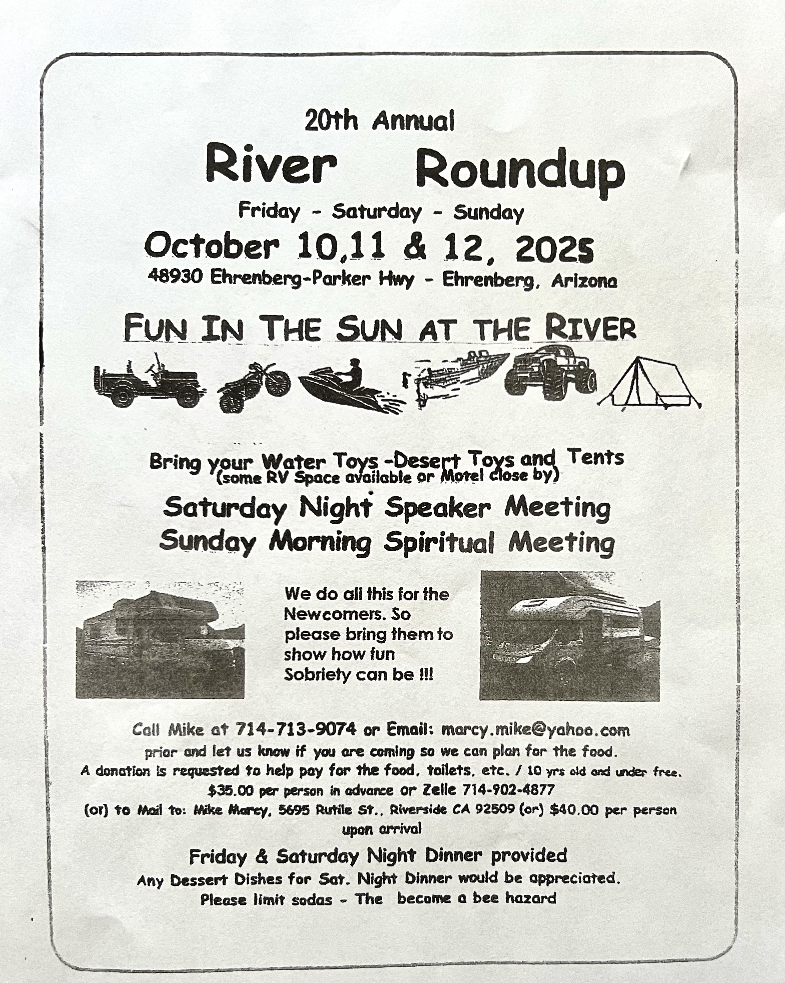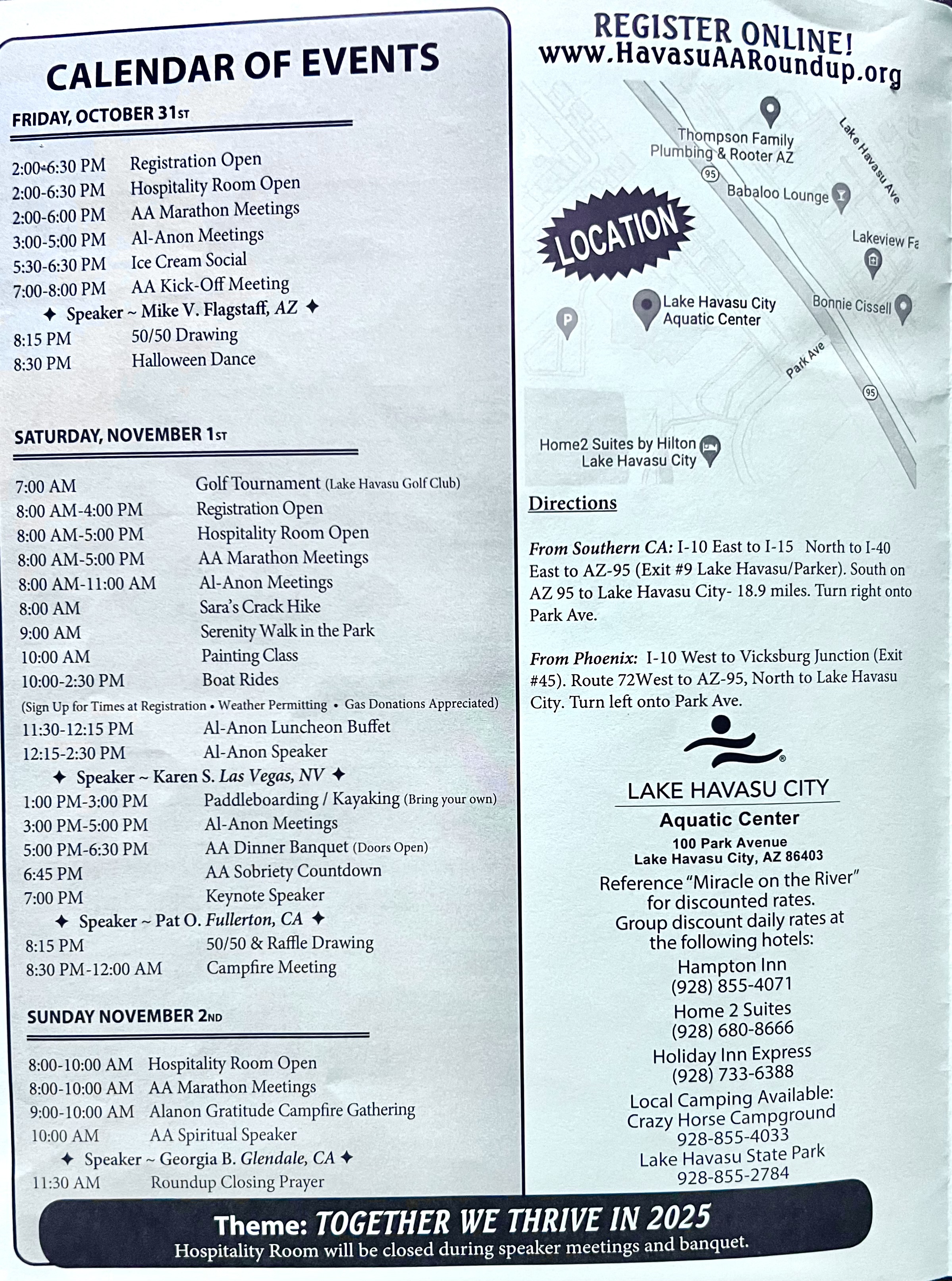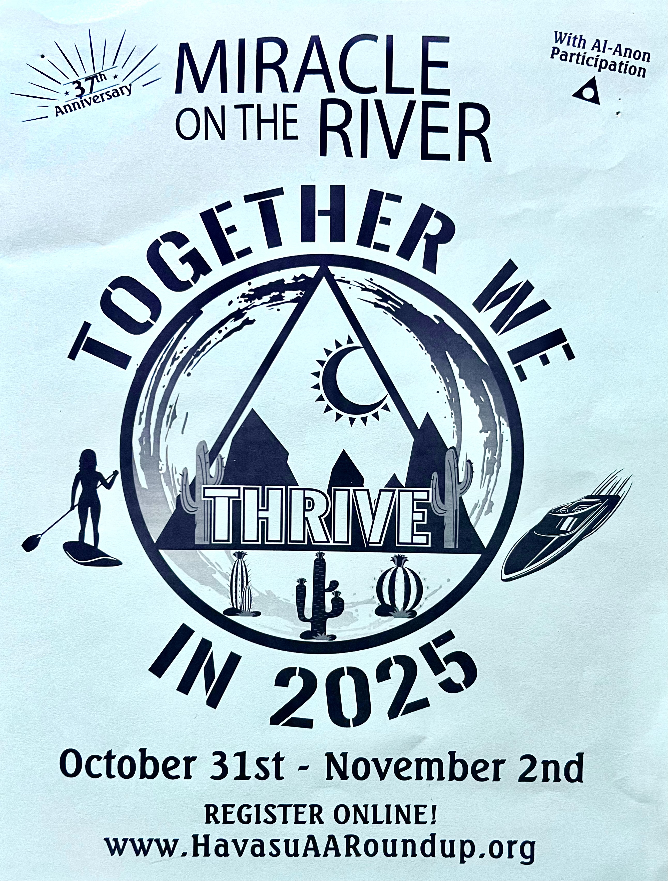 Spirit of the Universe Come celebrate your milestones in recovery at the lunch bunch group. It is the last Wednesday of the month and we begin at noon! AA-Alanon Family Weekend Fun in the sun at the river! Mark your calendar! Oct 31st to Nov 2. BIG BOOK STUDY WOMAN'S BIG BOOK STUDY JOE & CHARLIE De-mystifies the Big Book OPEN AA MEETING STEP 11 & MEDITATION GROUP